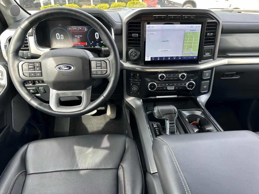 Bed Utility Package (BoxLink, LED Box Lighting, Power Tailgate, and Tailgate Step w/Tailgate Work Surface), Equipment Group 501A Standard, Ford Co-Pilot360 Assist 2.0 (Connected Built-In Navigation, Evasive Steering Assist, Intelligent Adaptive Cruise Control w/Stop & Go, Intersection Assist, and Speed Sign Recognition), FX4 Off-Road Package, Max Trailer Tow Package (Class IV Trailer Hitch Receiver, Extended Range 36 Gallon Fuel Tank, Integrated Trailer Brake Controller, and Pro Trailer Backup Assist & Pro Trailer Hitch Assist), 360 Degree Camera, 4-Wheel Disc Brakes, 8 Speakers, ABS brakes, Adjustable pedals, Air Conditioning, Alloy wheels, AM/FM radio: SiriusXM with 360L, Auto High-beam Headlights, Auto Start-Stop Removal (DISC), Auto-dimming door mirrors, Auto-dimming Rear-View mirror, Automatic temperature control, Brake assist, Bumpers: chrome, Chrome wheels, Compass, Delay-off headlights, Driver door bin, Driver vanity mirror, Dual front impact airbags, Dual front side impact airbags, Electronic Stability Control, Emergency communication system: SYNC 4 911 Assist, Exterior Parking Camera Rear, Front anti-roll bar, Front Bucket Seats, Front Center Armrest, Front dual zone A/C, Front fog lights, Front reading lights, Front wheel independent suspension, Fully automatic headlights, Garage door transmitter, Heated door mirrors, Heated front seats, Heated steering wheel, Illuminated entry, Inclination/Intrusion Sensor Removal, Interior Work Surface, Leather-Trimmed Bucket Seats, LED Sideview Mirror Spotlights, Low tire pressure warning, Memory seat, Occupant sensing airbag, Outside temperature display, Overhead airbag, Overhead console, Panic alarm, Passenger door bin, Passenger vanity mirror, Pedal memory, Power door mirrors, Power driver seat, Power passenger seat, Power steering, Power windows, Pro Power Onboard - 7.2KW, Radio data system, Radio: B&O Sound System by Bang & Olufsen, Rear reading lights, Rear seat center armrest, Rear step bumper, Rear window defroster, Remote keyless entry, Security system, Speed control, Speed-sensing steering, Split folding rear seat, Steering Wheel Heat Removal (DISC), Steering wheel mounted audio controls, SYNC 4 w/Enhanced Voice Recognition, Tachometer, Telescoping steering wheel, Tilt steering wheel, Traction control, Tray Style Floor Liner (47W), Trip computer, Turn signal indicator mirrors, Twin Panel Moonroof, Variably intermittent wipers, Ventilated front seats, Voltmeter, Wheels: 18" Chrome-Like PVD, Wheels: 20" Chrome-Like PVD, and Wireless Charging Pad.